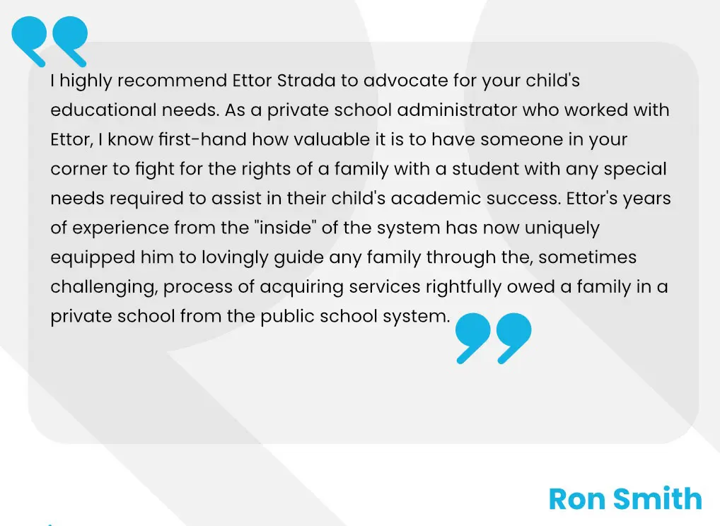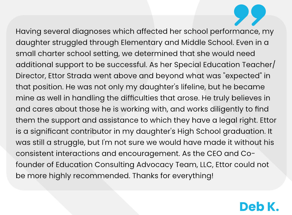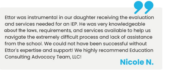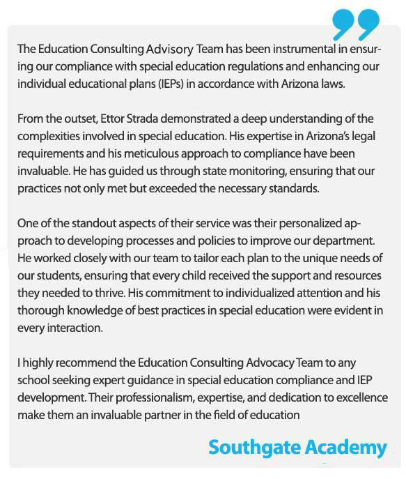 ECAT offers advisory services. ECAT does not offer legal advice; however, advice is given based on professional and personal experience and years of working in the field of education, specifically Special Education. If a situation arises where an attorney may be required, we will assist you in finding the correct attorney who specializes in the area of concern.